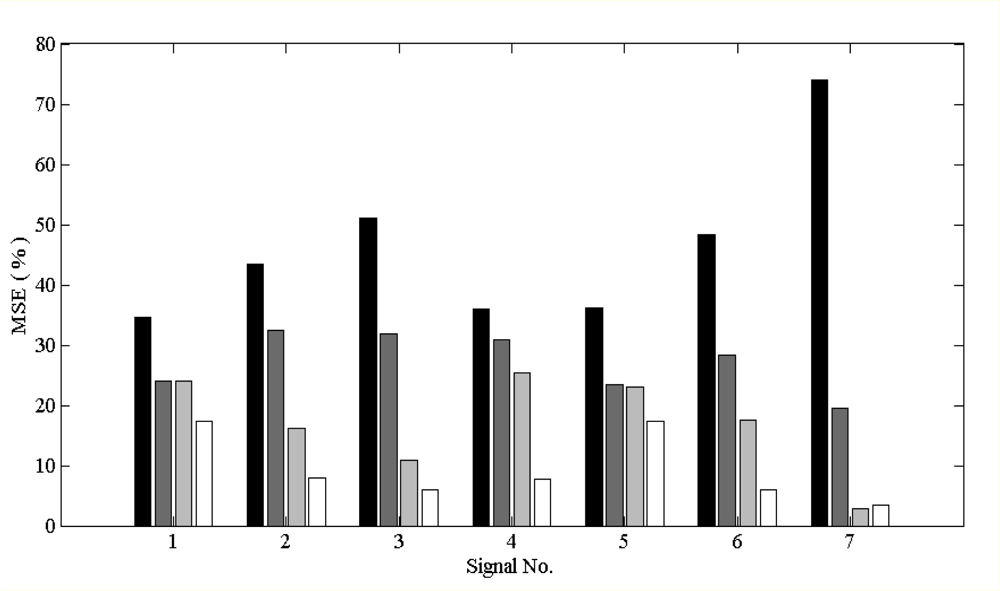 MSE percentage of all ECG contaminated with 100% composite noise. X-axis is the seven ECG segments, the same sequence with that shown in Figure 2. Each ECG segment has average MSE of four filters, from left to right sites are IIR, Wiener, EMD and EEMD. EEMD always has lowest MSE percentage among the four filters, and it is always true for normal ECG, and also for arrhythmia ECG.