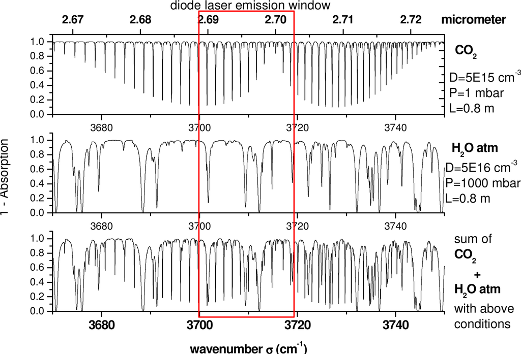 Diode laser emission window matched to low pressure CO2 (ν1 + ν3) and atmospheric H2O absorption lines in the 2.7 μm spectral region. The simulations are performed at values of density D, pressure P and absorption length L indicated in the figure.