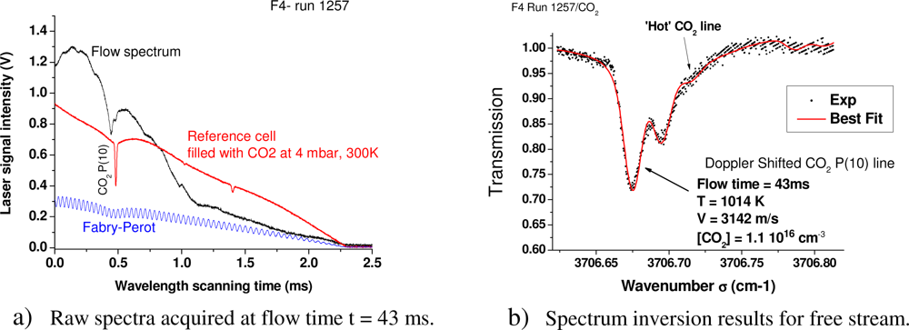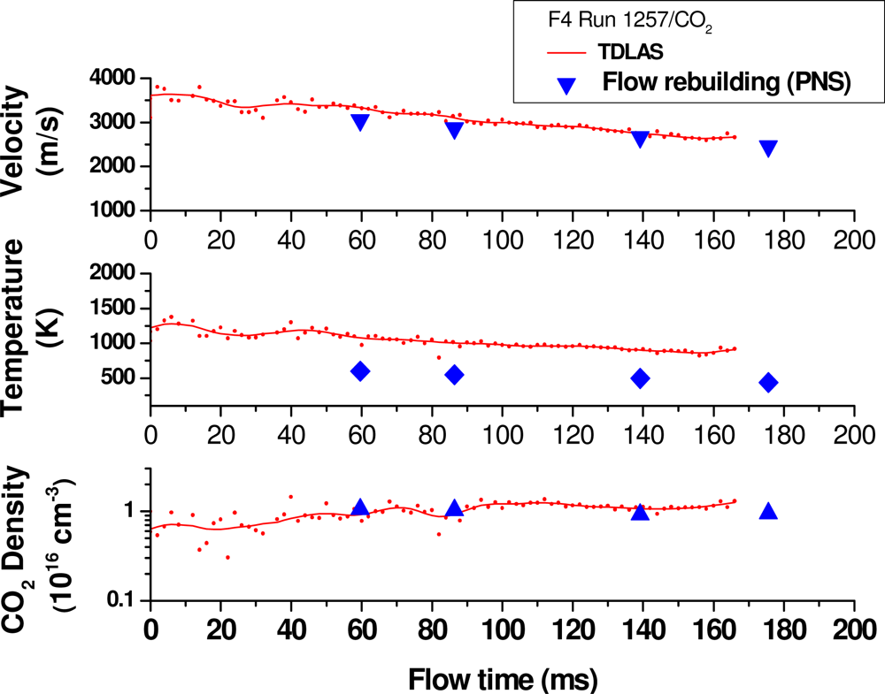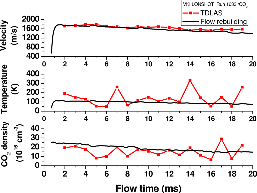 Even after these two milliseconds, the spectrum inversion on the CO2 P(8)e line yields free stream gas velocity, temperature and density with a relatively good agreement with results from free stream flow rebuilding based on measurements of plenum pressure and stagnation conditions in the free stream via a hemispheric probe [10,11].
