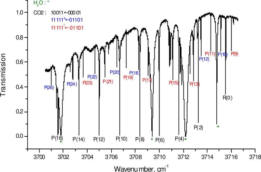 Figure 2 presents the experimental total spectral emission spectrum (about 16 cm−1 wide) of the laser diode in our setup exhibiting the absorption lines of CO2 obtained when the laser beam crosses at room temperature a 10 cm long cell filled with CO2 at a pressure of 4 mbar. These lines are overlapped with atmospheric H2O lines absorbed outside the cell on a distance of about 1 meter.