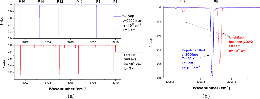 For the Longshot experiments, the spectral window is chosen to monitor the P(8)e CO2 line for velocity measurements (Figure 4b) as the primary objective. It includes a hot line (P(18)f) which should not be visible in the experimental spectra for the low temperature section of the flow but can help to monitor hot portions of the flow. The experimental conditions for the three runs we tested are summarized in Table 1.