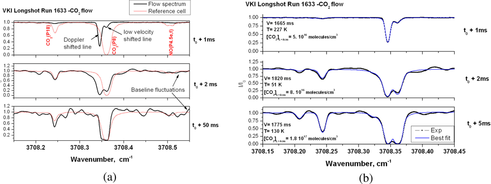 Anyway, all derived values for velocity, temperature and CO2 density must be interpreted with care because of the laser beam crossing the shock interactions region in between the fingers of the optical probe. However, if we retain only the measurements for the first two milliseconds, this measurement campaign allows us to validate the feasibility of TDLAS probing at 2.7 μm in this wind tunnel as well as the use of infrared fluorine fiber optics coupled to a miniature probe with short absorption path in the flow.
