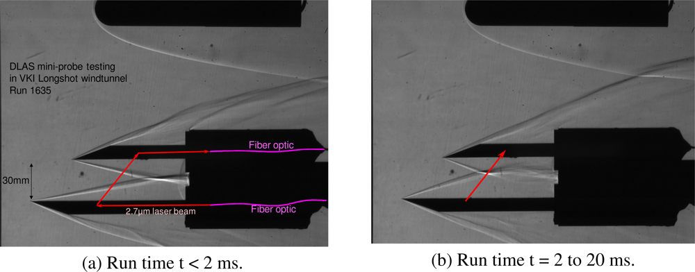 The high speed Schlieren video acquired during the run shows a small angle for shock layers at the beginning of the flow (Figure 6a). Unfortunately, after two milliseconds, these angles increase to bring the shock interactions on the path of the laser beam (Figure 6b). The large fluctuations of the shock-shock interaction zone induce disturbances of the laser beam and oscillations on the baseline of acquired spectra.