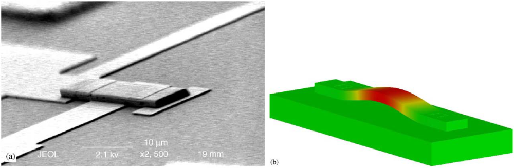 SEM of a microbeam resonator (a) and its 1st modal shape simulated by CoventorWare (b) [50].