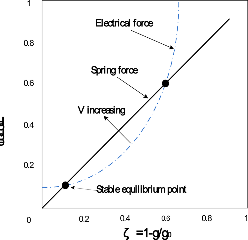 The electrical and spring force for voltage-controlled parallel-plate electrostatic actuator [93].