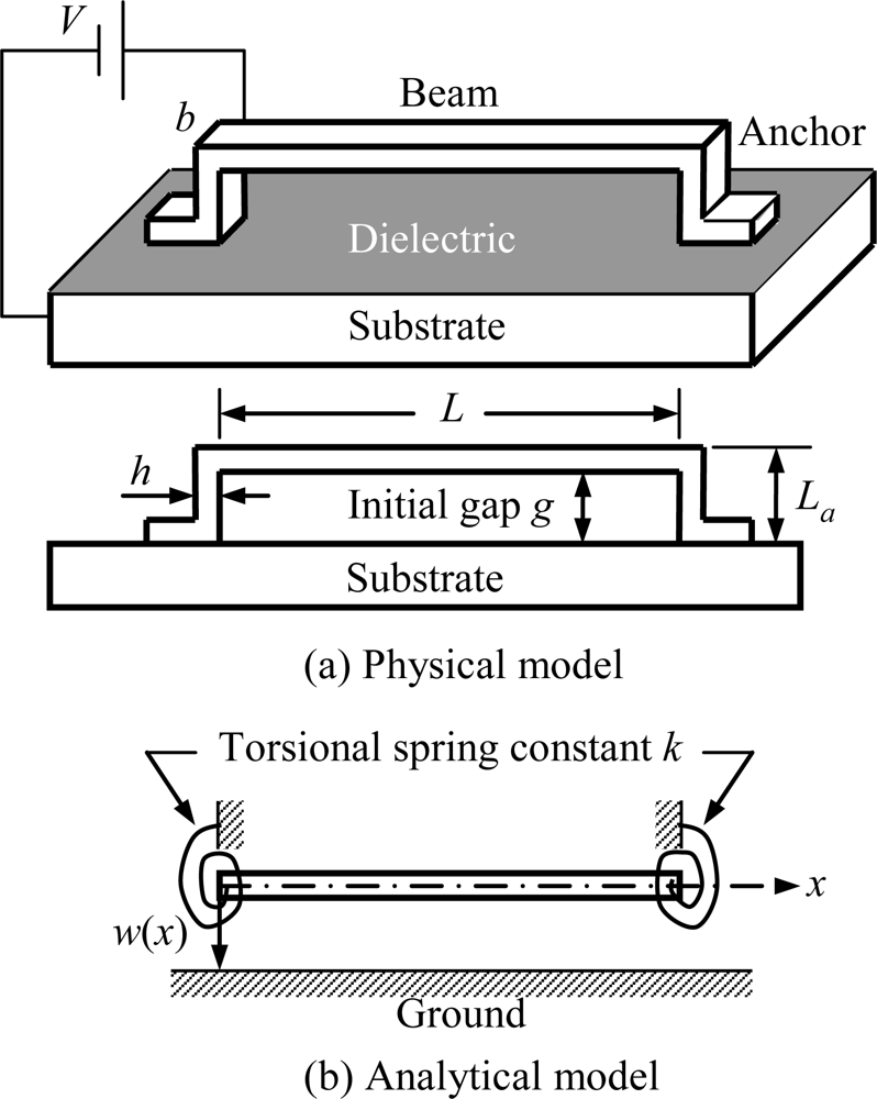 The beam is with length L, anchor height La, width b, thickness h, and initial gap g, which subjected to a driving voltage V, resulted in a position-dependent deflection w(x). The equivalent torsional spring constant k can be expressed by the following equation [34]: