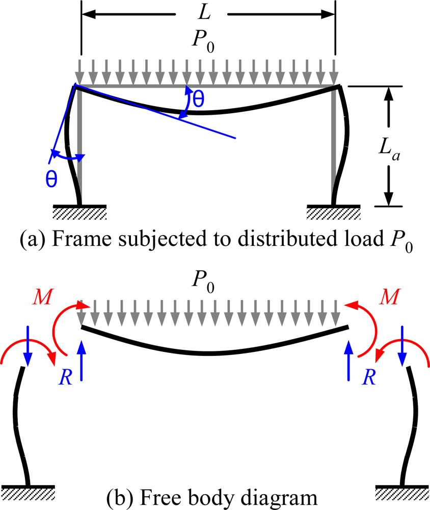 (a) Frame subjected to distributed load P0, (b) Free body diagram [34].