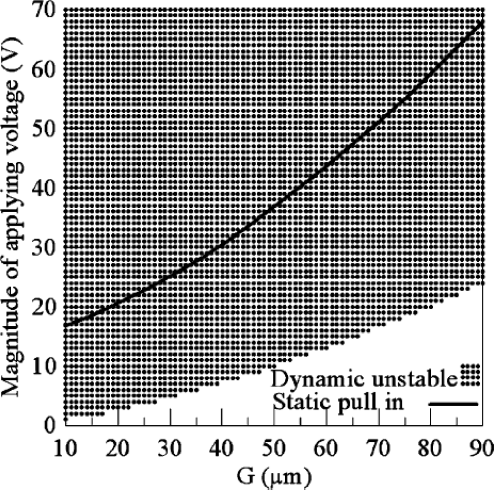Furthermore, the instable regions of the dynamical pull-in expand with the increasing of applied voltage, as shown in the dot-area of Figure 8. If the structure acts in small deformation condition, the beam can be considered as linear. On the contrary, for large deformations, non-linear structural effects have to be considered. For solving the non-linearity problem, one can use the finite element analysis (FEA) to obtain a non-linear cubic term. Moreover, it would be helpful to predict non-linear mechanical stiffness behavior [71,72,102,103]. The governing equation of a vibrating system with cubic stiffness non-linearity can be written as [50]: