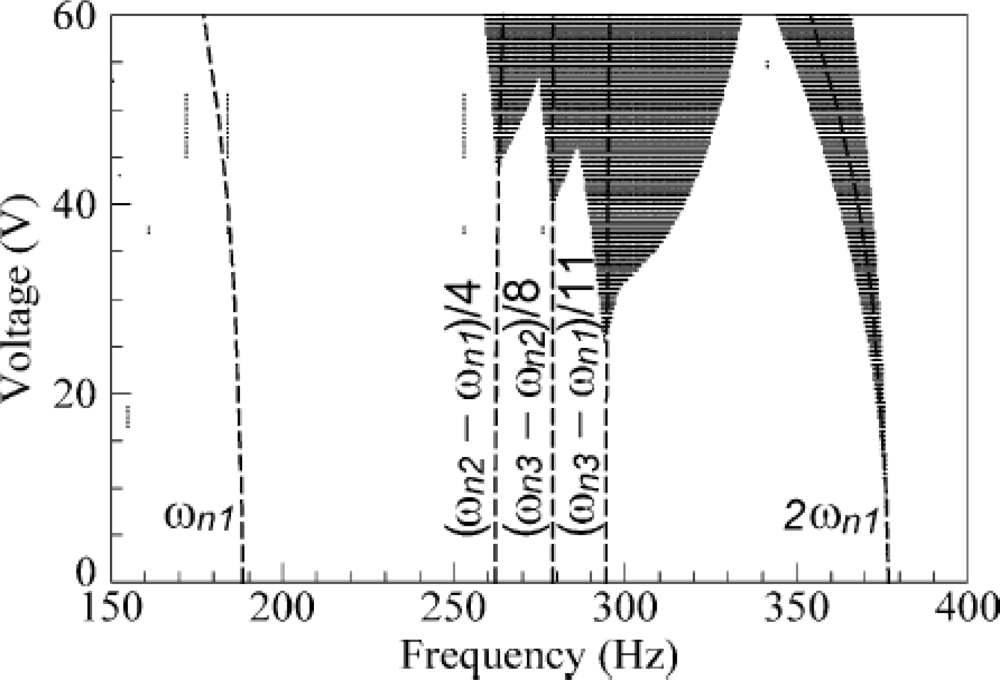 Dynamical instable region of a microcantilever subjected to an AC voltage [80].