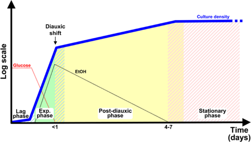 The budding yeast Saccharomyces cerevisiae is the first eukaryote whose genome was completely sequenced [1] and its ease of manipulation and the wide array of molecular and post-genomic techniques available make it a preferred model organism for genetic, biochemical and, more recently, systems biology studies [2–4]. S. cerevisiae can be grown both in batch and continuous cultures under a variety of conditions that allow modulation of its physiological response. In any given growth medium supporting cellular proliferation, a time window can be defined in batch cultures in which macromolecular syntheses and cell division are coordinated, so that any given intracellular parameter, such as protein or DNA distribution in the population, is constant. This so-called “balanced exponential growth” (solid green area in Figure 1), is usually preceded by a lag phase (white and green stripes in Figure 1) and followed by a transient phase leading to stationary phase. Upon nutrient exhaustion yeast cells enter into a non-proliferating, quiescent state (white and red stripes in Figure 1), characterized by strongly diminished transcriptional and protein synthesis rate, severely reduced expression of genes encoding ribosomal proteins and induced transcription of stress responsive genes, accumulation of storage carbohydrates, thickened cell wall, enhanced stress resistance, chromosomes condensation and autophagy (the process of engulfment of the cytoplasm into lipid vesicles which are delivered to the vacuole for degradation) [5].