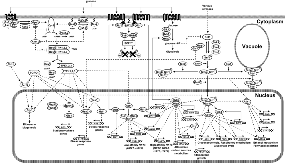 The three glucose sensing pathways are intertwined in a complex regulatory network with multiple feedback and feedforward regulatory loops that serves to fine-tune the cellular response to glucose availability.