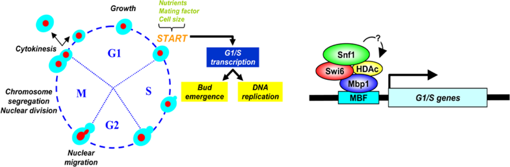 Snf1 is involved in control of MBF G1/S specific transcription factor. The left panel shows a simplified view of the yeast cell cycle showing some of its morphological and biochemical markers. The role of G1/S specific transcription is highlighted. The right panel shows known and putative interactions of Snf1 with proteins at MBF-dependent promoters. Not all proteins known to be bound at MBF-dependent promoters are shown. The Swi6 subunit of MBF transcription factor recruits the a-catalytic subunit of Snf1 to MBF-dependent promoter. Mbp1 and Swi6 form the MBF factor which binds the MBF-dependent promoters found upstream of genes involved in of the G1/S transition. A possible interaction of Snf1 with histone deacetylase (HDAC) at MBF-dependent promoters is shown, based on available evidence that mammalian AMPK and Snf1 can interact with histone acetylating/deacetylating enzymes (see text for details).
