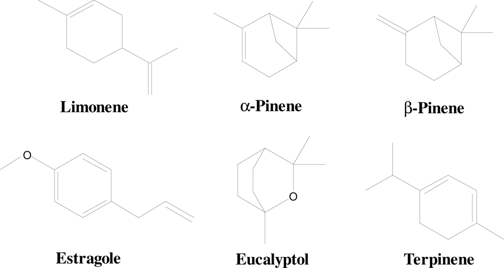 Some attempts [19,20] have already been made in order to detect terpenes in herbs using MIP-based QCM, and selectivity has been identified as the most important challenge in this field. During the course of this investigation we developed QCMs with six channels, coated with MIPs for continuous and online monitoring of terpenes emanated from fresh and dried species of the Lamiaceae family i.e., rosemary (Rosmarinus Officinalis L.), basil (Ocimum Basilicum) and sage (Salvia officinalis). Additionally, headspace GC-MS analysis of the herbs was carried out. Both devices were calibrated with selected terpenes showing relevance in different aspects [2124]. Our measurements will guarantee freshness. This quality control of fresh and dried herbs will reveal the shelf life of these herbs after several days of measurements. Polystyrene (PS) and divinylbenzene (DVB) copolymers were used for molecular imprinting by terpenes of interest i.e., α-pinene, limonene, eucalyptol, β-pinene, terpinene and estragole. Figure 1 shows the chemical structures of all six templates which were selected on the basis of headspace GC-MS analysis of volatile ingredients of herbs before proceeding to record real time measurements. Optimization is performed in respect to layer composition concerning cross linkers as well as for layer heights to attain optimized results. Despite to close resemblance in structures of the emanated terpenes, MIPs will show high sensitivity and selectivity towards their corresponding templates due to geometrical adaption.
