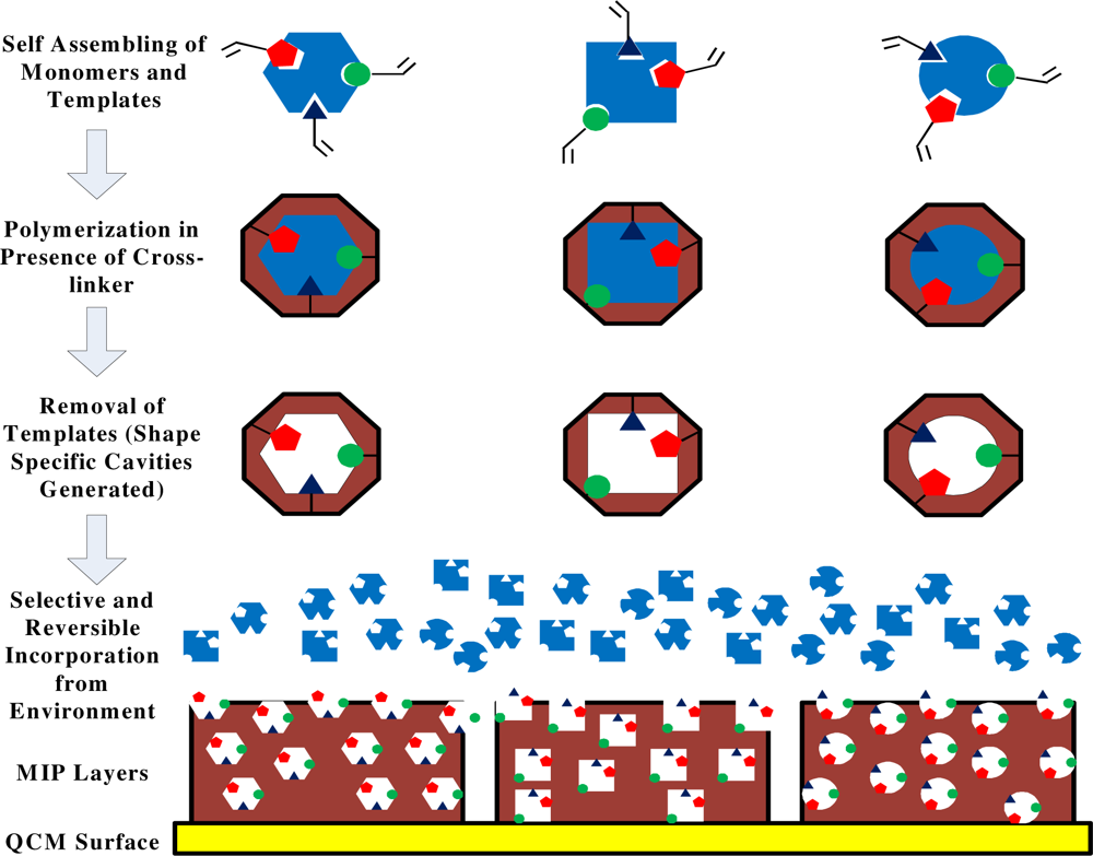 The sensor array consisted of two quartz sheets; each containing three gold electrodes and electrode structure was printed on the quartz surface by screen printing procedure. MIPs were synthesized by mixing 30 μL styrene as functional monomer, 70 μL DVB as cross-linker, 2 mg AIBN radical initiator and 5 μL diphenylmethane as porogen. Three hundred μL of template was added to this mixture for imprinting as optimized from a number of observations, so six MIPs were prepared with different terpenes. Finally, each mixture was polymerized for 40 min at 70 °C. Layers of these polymers were coated on electrode by spin coating. To avoid mixing of the polymers, a specially designed polydimethylsiloxane (PDMS) block consist of two pieces was used. The upper piece contained three holes which just fit over three electrodes of the QCM. Quartz plate is fixed in between these two pieces and the required quantity of polymer solution is poured into the holes before spinning it with a specific speed. For polystyrene layers, 5 μL of each MIP solution was used and spinned at 2,000 r/min for 45 s. The resulting layers leads to a frequency shift of 1–6 kHz which corresponds to a layer height of 40–240 nm. Layers were dried overnight at room temperature to evaporate the template leaving behind specifically adapted cavities. A graphical representation of the imprinting procedure is given in Figure 10.