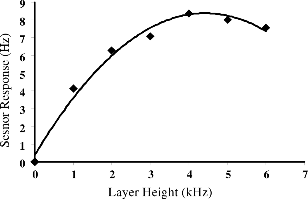 The relationship of MIP composition in relation to the sensor signals obtained is revealed in Table 1. A normalized response of the MIP-layers to limonene and eucalyptol respectively is given. Optimized signals were obtained with a 1/1.5 styrene/DVB copolymer composition, using 10 μL of templates, whereas other layers and template concentrations show lower responses. It is obvious that an increase in crosslinker will lead to a more rigid polymer capable of functionalizing the material in respect to cavities. Furthermore, the amount of template is very decisive. Only a few number of template molecules will generate less interaction centers in the coating, thus a diminished sensor effect will result. A high amount of imprinted molecules causes a dilution of the monomers and an effective polymerization is hindered. The sensor properties of the coatings are tailored according to these ideas [16]. We used different layer heights of polymers in the range of 1–6 kHz, where 1 kHz corresponds to a thickness of 40 nm. This variation of sensor signal is demonstrated in Figure 2 and an optimum layer height is observed. Obviously this finding can be attributed to a bulk behavior since the response increases in parallel to layer height. At a layer height of approximately 4–5 kHz a plateau formation is followed by some hint for a slight decrease in frequency response. This behavior is easily understood by analyte diffusion in the interior of the layer. Thin layers incorporate analytes easily due to the pores which are generated additionally by the templates. An increasing layer height will statistically block the excess to the diffusion channels and thus the behavior in Figure 2 is explained.