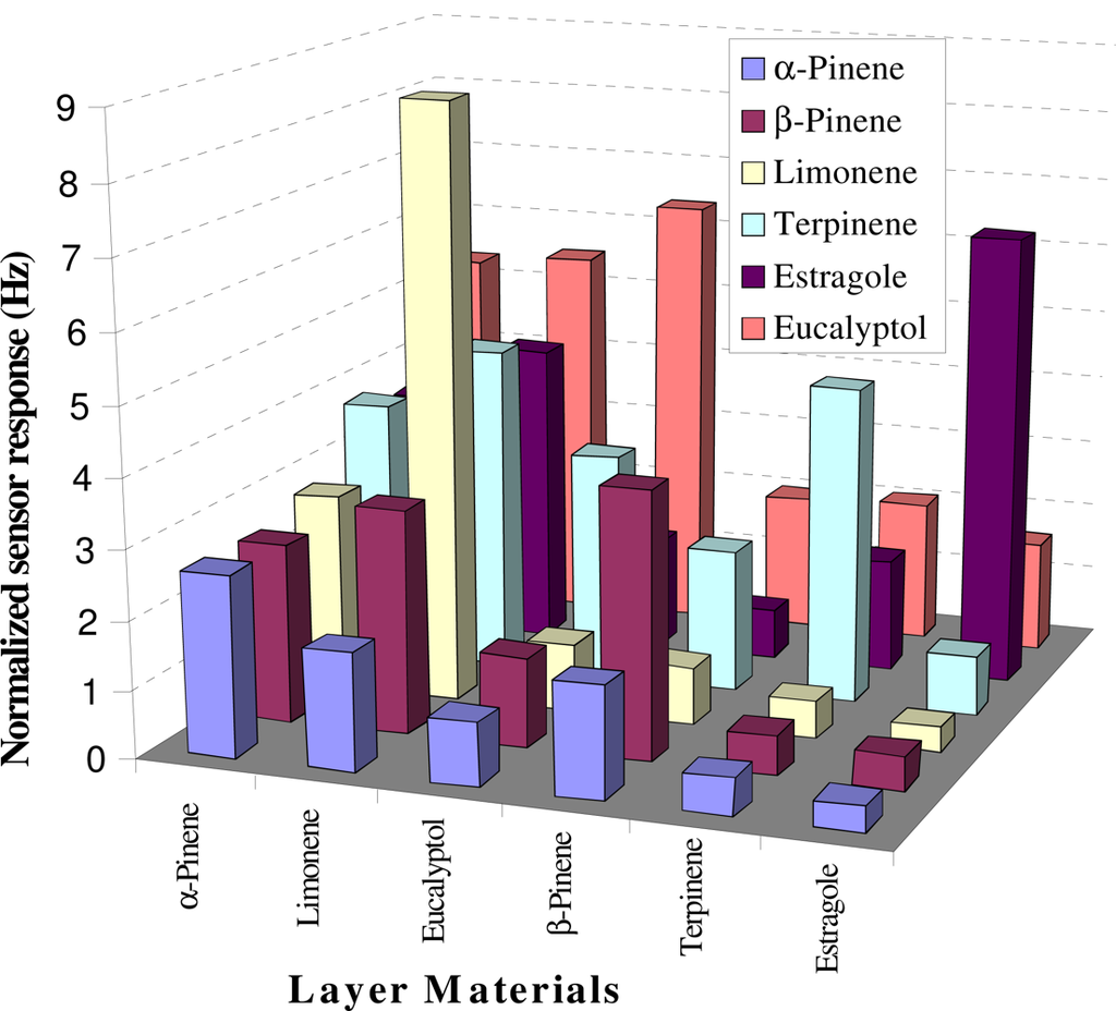 Figure 3 shows the selectivity pattern of all polymer layers at 50 ppm concentration of each analyte. The sensor array is alternatively exposed to different analytes with the same concentration and normalized according to layer height. The astonishing observation is the capability of the sensor array to distinguish isomeric compounds as α-pinene and β-pinene. Similarly all other layers showed maximum selectivity towards their corresponding templates. Thus the designed sensor array proved to be sensitive and selective for online monitoring of terpenes emanated from fresh and dried herbs. In addition, a sensing ability of sensor for analytes with similar structures is beneficial in regard of analyzing complex mixtures. Such problems are best addressed by multivariate analysis and the collected data should be analyzed through modern data analysis tools which are important part of today’s electronic bio-mimetic instruments.