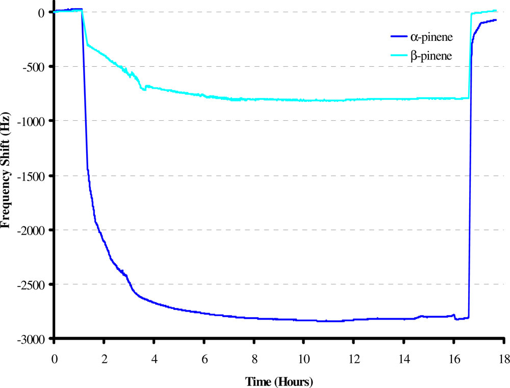 This sensitive and selective e-nose was used for online monitoring of fresh and dried rosemary, basil and sage. For fresh herbs each measurement was continued for 5–7 days, whereas for dried ones it took three days. The time of each measurement depended upon the abundance of terpenes recorded by headspace GC-MS analysis. Figure 4 shows the sensitivity profile of some original data on terpenes emanated from fresh rosemary; the “on-line” monitoring was performed via 10 MHz QCM. The responses of two sensors were chosen which were templated with β-pinene and α-pinene, respectively. It is observed that each sensor shows a characteristic response depending on the template molecule.