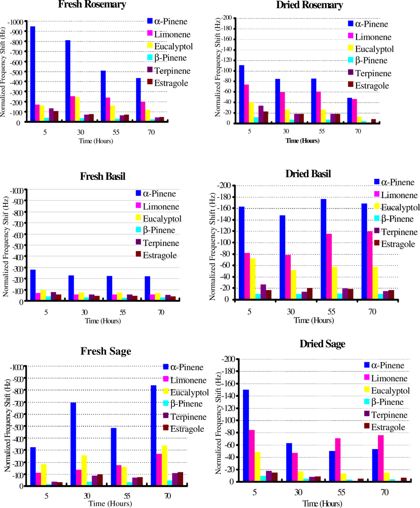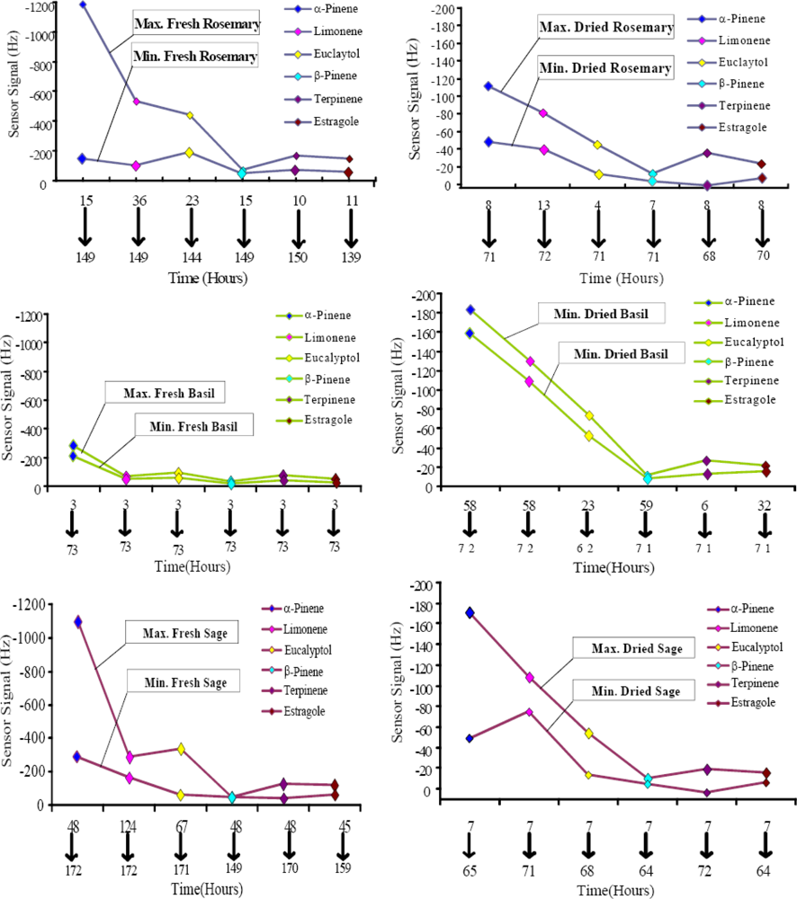 Figure 8 shows a comparison for fresh and dried species of herbs from maximum to minimum sensor signal. In case of fresh rosemary high sensor responses for selected terpenes i.e., 1183 Hz for α-pinene, 533 Hz for limonene, 445 Hz for eucalyptol, 74 Hz for β-pinene, 170 Hz for terpinene and 149 Hz for estragole were observed in between 40 hours, whereas the minimal sensor signals (9–157 Hz) were observed till the 150th hour. This suggests that the best time of its use under usual environmental conditions is within first 36 hours after being removed from the garden.