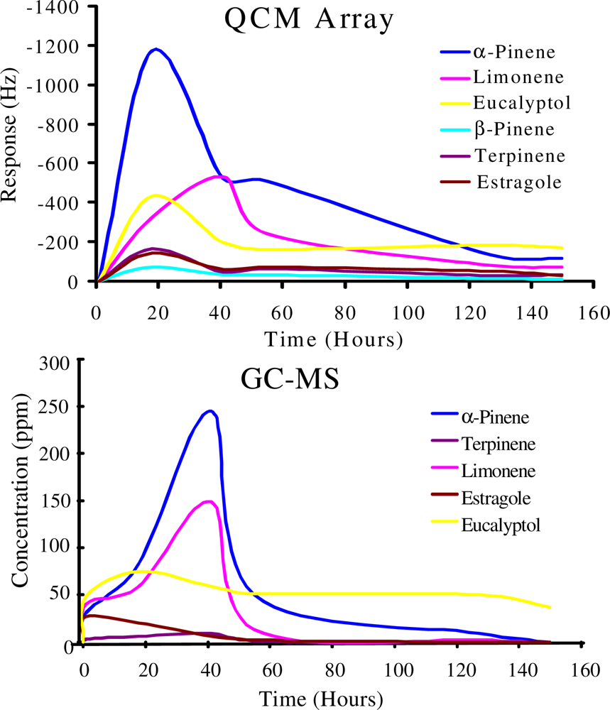 A quite similar emanation behavior was observed from both devices when exposed to fresh and dried herbs. Vapors of terpenes emitted from fresh and dried herbs were transferred through a heated Teflon sample-tube for GC-MS analysis. The data obtained showed that a maximum amount ≤250 ppm of α-pinene, ≤150 ppm of limonene, and ≤75 ppm of eucalyptol were detected whereas ≤20–30 ppm of terpinene, and estragole were observed in fresh rosemary. Consequently the minimum amount of the different terpenes that can be detected by the QCM sensor array in its defined position with relation to the emanating herbs at ambient environmental conditions was estimated to lies beyond at least 20 ppm. From these observations, the working strategy of the e-nose efficiently enlightened its mass sensing capability and it can be concluded that the proposed e-nose is ideal and cost effective to work for online measurement.