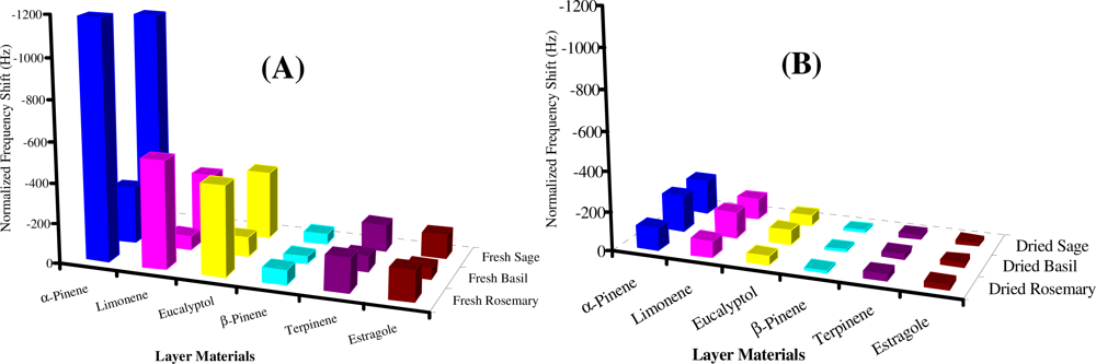 Imprinting e.g., with β-pinene yields frequency shifts by more than a factor of two compared to α-pinene. After a stable baseline was established a constant vapor pressure of rosemary emanations was reached, and the frequency shift is lowered by ≤2,800 Hz and ≤700 Hz for the layers. Thus, a stable sensor behavior was observed for several hours, leading to a highly reproducible sensor signal at the end point. Sometimes minute fluctuations of sensor responses were monitored, depending upon temperature changes which can be eliminated by differential measurements. A similar trend was observed for all fresh and dried herbs.