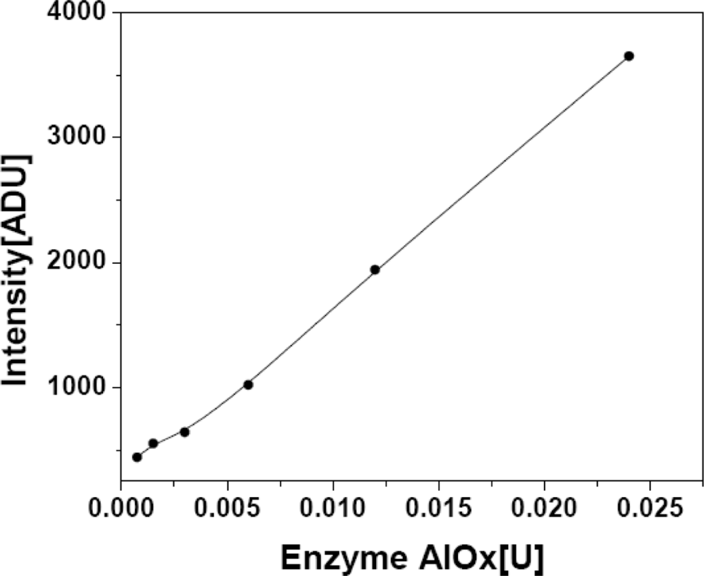 Enzyme concentration is one of the critical factors to be evaluated in any inhibition based assay. Optimization of reaction parameters for a single enzyme system i.e., HRP/H2O2 was achieved first and was subsequently optimized for the bi-enzyme reaction. To optimize enzyme concentration, substrate was taken in an excess amount, i.e., reaction is independent of the substrate concentration. Different units of AlOx were allowed to react with 0.5 mM methanol. Enzyme concentrations from 0.00075–0.024U per assay volumes were tested for the optimization of enzyme concentration. Considering the total assay volume versus bienzyme response, it was possible to achieve good optical signal with 0.00075U of free AlOx. In the optimized bienzyme reaction, final concentration of AlOx (0.01U) and HRP (0.001U) were used in 100 μL assay. The results are presented in Figure 1.