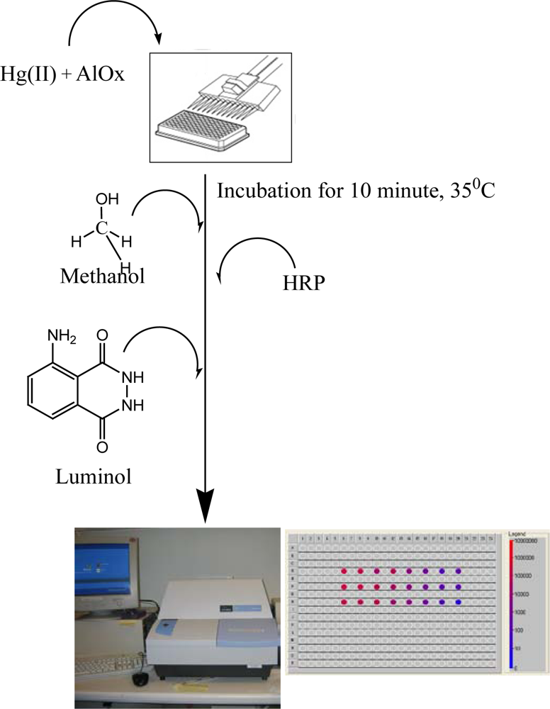 Step (1) is catalysed by AlOx which oxidises methanol to formaldehyde and hydrogen peroxide. In step (2) peroxidase converts H2O2 into H2O, O2 and light (hυ) is liberated. As a side product aminophtalic acid anion and N2 are produced. The signal due to the light intensity (hυ) is correlated to the concentration of methanol and AlOx in solution. In step (3) after the incubation with Hg(II), the enzyme activity was observed in terms of light liberated (hυ). The degree of inhibition was expressed by the ratio of the photon liberated before and after the Hg(II) inhibition.