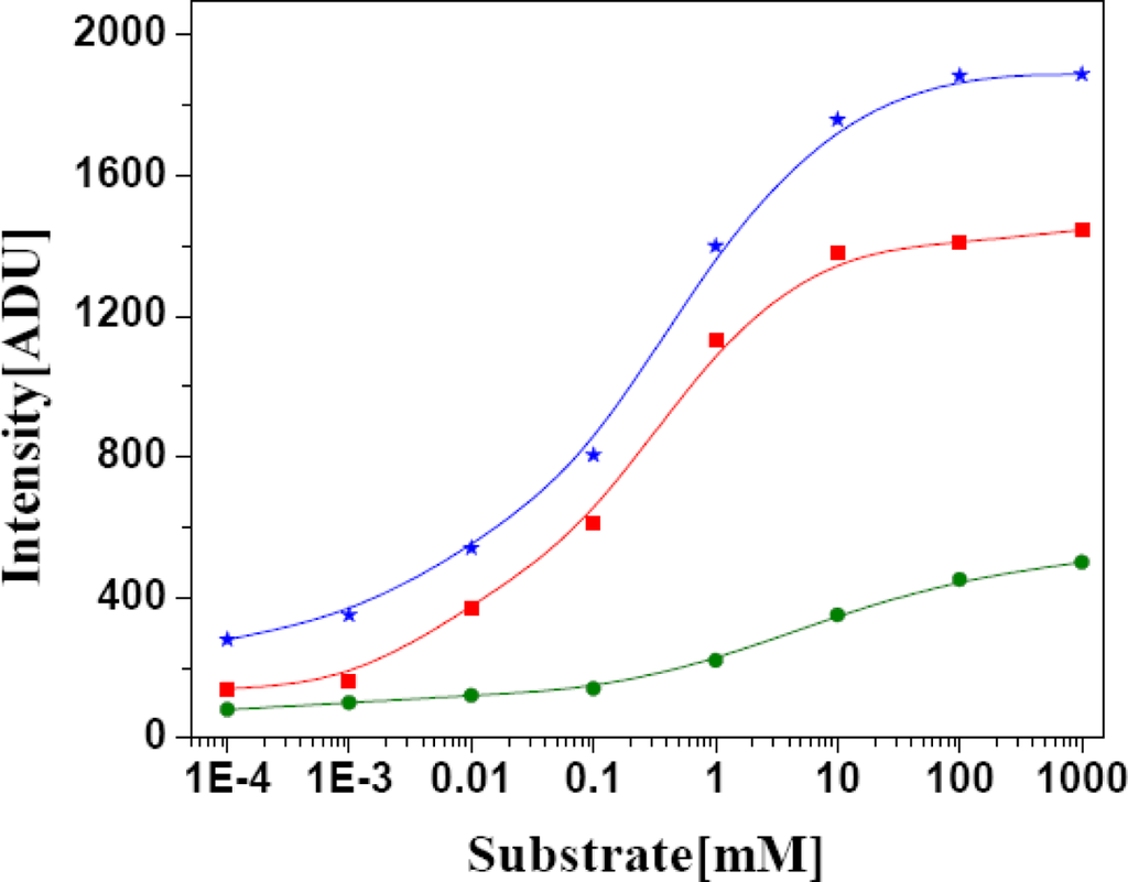 For AlOx, various substrates e.g., propanol, ethanol and methanol have been reported. For all the primary alcohols studied in 96 as well as 384 well format, signal intensity increased with increasing substrate concentration, as shown in Figure 2. The signal intensity increases linearly up to 1 mM substrate concentration and remains stable over the range from 0.001–1 M with AlOx in the bi-enzymatic reaction. Among the various substrates, AlOx exhibited highest activity with methanol. Thus methanol was selected for further optimization. In order to determine the KM, methanol concentration was varied in the range 1 μM−1 M and response signal against 0.01 U AlOx was recorded. The experimental data was used to calculate KM. Alternatively data was fitted with Line weaver Burk plot to reconfirm KM value. The KM for methanol was calculated to be 0.5 mM. Further assays were carried out with 0.5 mM methanol. Optimized assay parameters for enzymatic assay developments are summarized in Table 1.