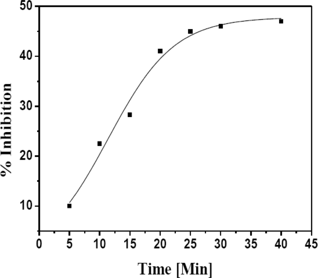 Incubation time plays a significant role in the determination of the degree of enzyme inhibition. Wide range of incubation time (2–25 min) is reported for heavy metal determination [9–21]. Incubation time for mixture containing 0.1 ng·mL−1 Hg(II) and 0.01 U AlOx was varied in the range 5–40 min. We observed decrease in the enzymatic activity up to 40 min. A linear trend for inhibition with increasing incubation time was observed from 5–20 min with 40% inhibition. From Figure 3 it is clear that after 20 min, further increase in incubation time does not impart any appreciable inhibition to AlOx (47% I). Thus, for further inhibition studies 20 min was optimized as incubation time.