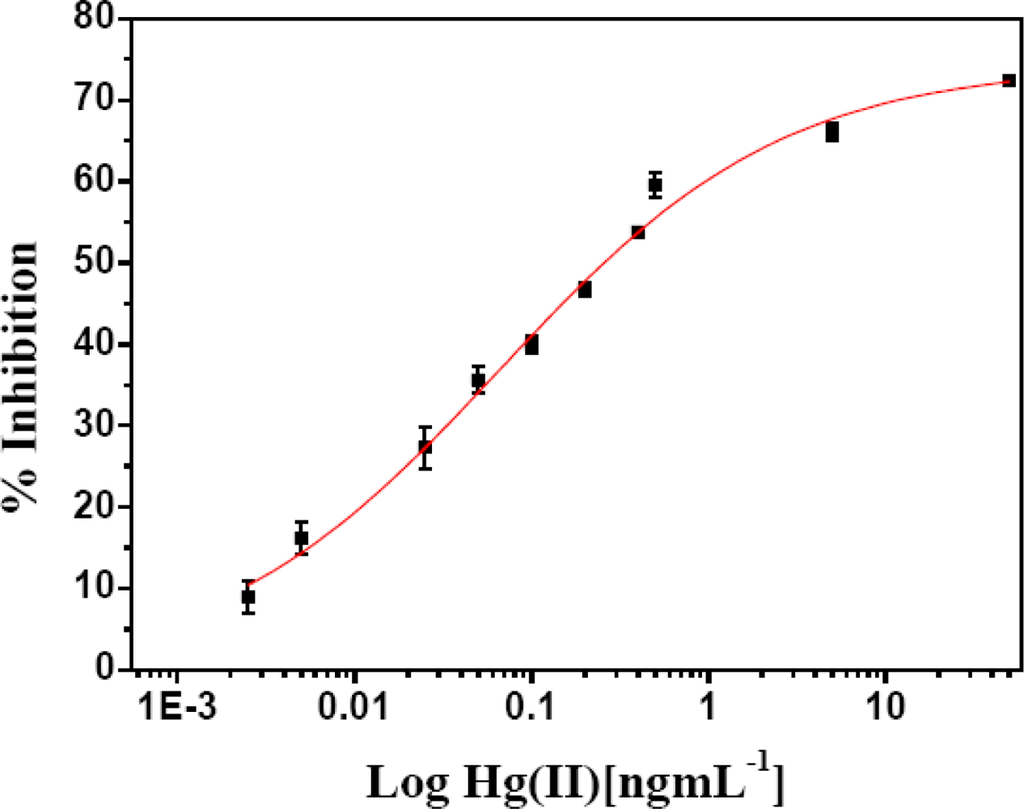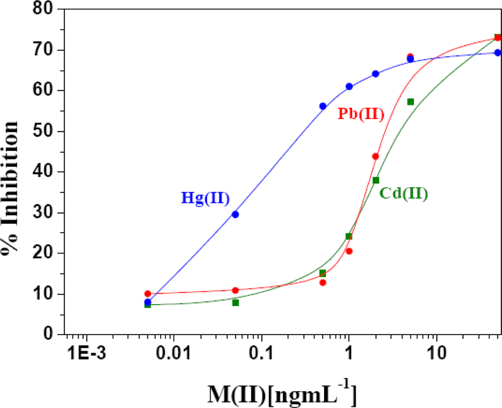 Inhibition values were plotted against Hg (II) concentration for dynamic as well as linear range in the calibration curve. The Limit of Detection (LOD) value generally corresponds to 90–80% of residual activity that is 10–20% inhibition. For calculation of detection limit 10–20% of inhibition was taken as a reference [35].