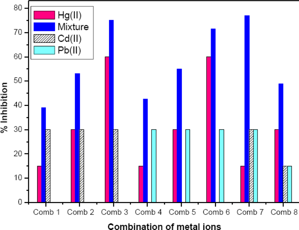 Thus, the study demonstrates that all the metal ions inhibit AlOx significantly higher when they are combined than when they inhibit AlOx individually. Various combinations were prepared to study interactive effect. It is evident from Figure 6 that in case of combinations 3 and 6 where Hg(II) concentration is corresponding to IC60, the inhibition of AlOx is solely due to Hg(II).