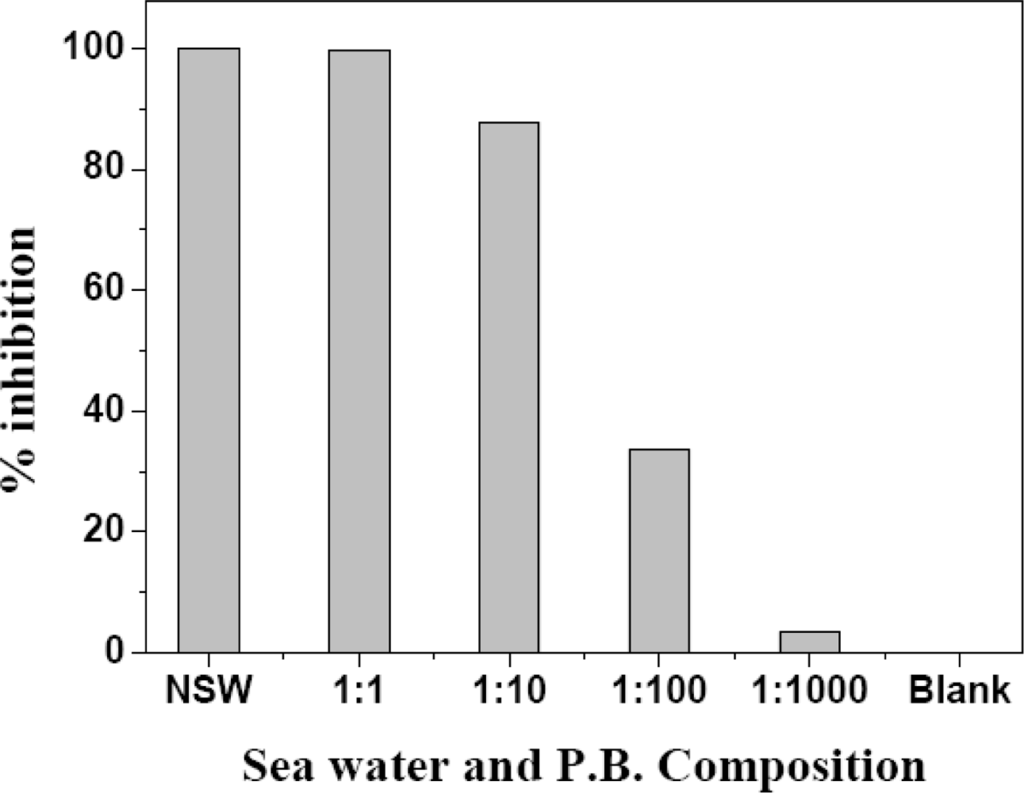 Matrix effect of sea water on enzyme activity. Filtered sample was diluted with 0.1 M PB pH 7.5 in various dilution range and shows minimum matrix effect around 1:1000 dilution where 1 part comprise of sea water and 1,000 part PB (NSW; natural sea water).