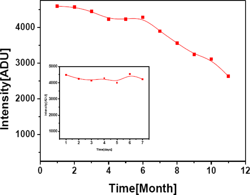 Inter-day stability of AlOx in bi-enzyme reaction in 96 well plate formats activity over the period of 11 months. Inset: activity over the period of one week. 0.5 mM methanol with 0.001U HRP and 1mM luminol were used throughout the assay period.