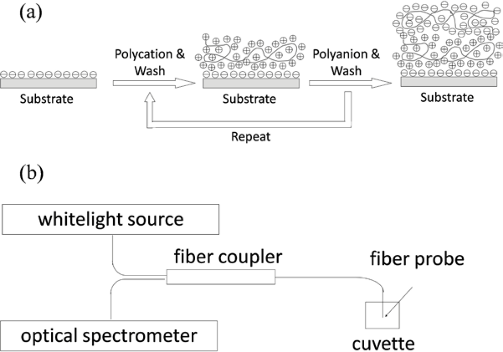 Colloidal AuNPs for synthesizing ISAM gold films were prepared using traditional Turkevich method through reducing gold (III) ion of hydrogen tetrachloroaurate (HAuCl4) to gold solid with sodium citrate as a reducing agent [17]. Powder of HAuCl4 and sodium citrate are purchased from Sigma-Aldrich Corp. 16nm-diameter AuNPs were used to fabricate ISAM films in our experiments, because smaller the size of AuNPs, more robust the assembled ISAM films. The ISAM deposition process, also known as layer-by-layer (LbL) deposition, is schematically shown in Figure 1a [9–16]. Through alternately immersing a charged substrate into anionic and cationic polyelectrolyte aqueous solutions, a nanoscale multilayer thin film is built due to electrostatic forces. The combination of one monolayer of polycation and polyanion is denoted a bilayer. In our experiments, an optical fiber was used as a substrate, citrate-anion coated colloid AuNPs were used as the polyanion while poly(allylamine hydrochloride) (PAH) at pH = 4.3 was used as the polycation. Bi-directional 1 × 2 50/125 multimode fiber couplers (Fiber Instrument Sales, Inc.) were used for reflection spectra measurements. The fiber of the coupler is Corning InfiniCor 600 graded-index multimode fiber. Its core diameter and cladding diameter are 50 μm and 125 μm respectively, numerical aperture is 0.2, and group index of refraction at 850 nm is 1.481. The optical source is HL-2000-HP Tungsten Halogen Source (Ocean Optics, Inc.). Reflection spectra were measured using an HR4000 Spectrometer (Ocean Optics, Inc.). The schematic of optical setup is shown in Figure 1b.