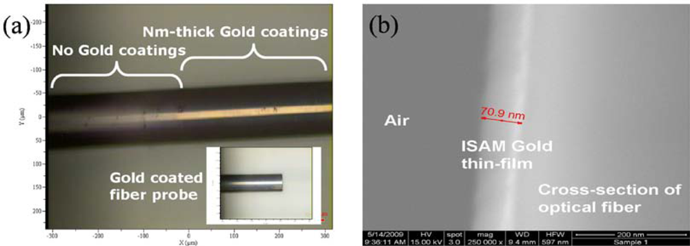 First, we demonstrated the feasibility of constructing nm-thick gold film coated fiber probes by depositing AuNPs onto fiber end-faces through ISAM process. We deposited 10-bilayer PAH/AuNPs films onto the fiber end-face to construct the fiber probe using 16 nm-diameter AuNPs. We alternately immersed the fiber probe into PAH and AuNPs solutions. Figure 2a shows the color picture of the ISAM gold film coated fiber probe imaged by brightfield microscopy. We can clearly see the gold metallic color in the portion of fiber with ISAM gold film coatings, and the inset exhibits a cleaved fiber probe with ISAM gold coatings. Figure 2b shows the SEM picture of cross-section of the ISAM gold film coated fiber after we cleaved the optical fiber.