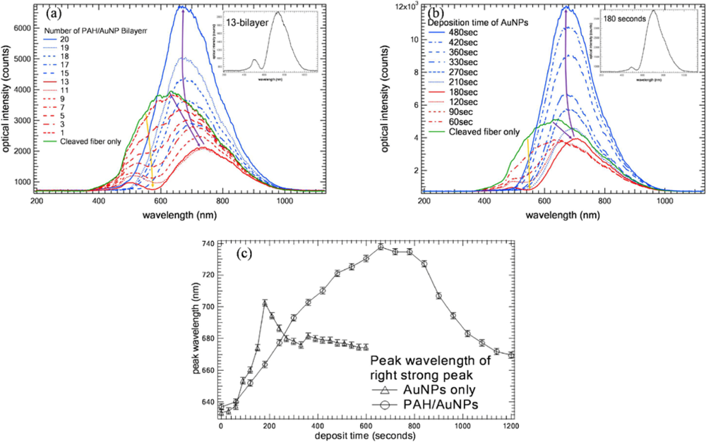 Localized surface plasmon resonance (LSPR) is the resonance phenomenon of surface plasmons in the metal [1,2]. It occurs when light interacts with particles much smaller than the incident wavelength. Because LSPR is sensitive to changes in the local dielectric environment, it has been extensively studied for use in optical spectroscopy and biosensing applications [3]. In addition, because fiber optic biosensors have been attractive due to their advantages such as light, compact, remote sensing capability, and multiplexing capability, the combination of fiber optics and LSPR technique potentially can be used to construct high-sensitive, small biosensors for biosensing applications [4–7]. Usually people use either the covalent-bond self-assembly monolayer (SAM) technique or the lithography technique to immobilize or fabricate the gold nanoparticles (AuNPs) on the substrate [4,8]. However, SAM technique is time consuming and it is unable to make multilayer films, whereas the lithography technique is not only time consuming but also expensive.