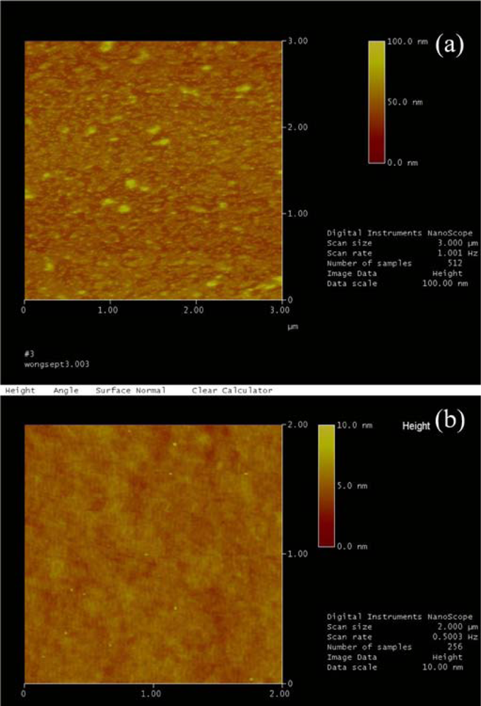AFM images of end-face of (a) 12-bilayer PAH/AuNPs coated fiber probe with the 570 nm-attenuation valley in reflection spectrum, and (b) 20-bilayer PAH/AuNPs coated fiber probe without the 570 nm-attenuation valley in reflection spectrum.