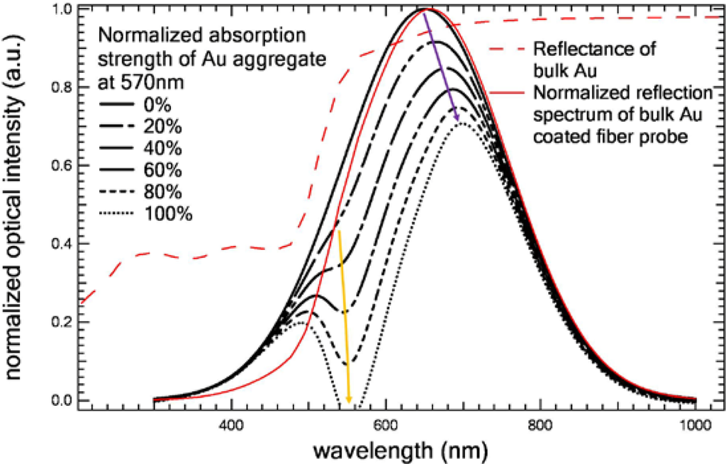 Calculated reflection spectrum of Au aggregate coated fiber probe as a function of attenuation strength of Au aggregate at 570 nm, red thin curves show reflectance of bulk Au film and normalized reflection spectrum of bulk Au film coated fiber probe. Yellow arrow and purple arrow indicate the trend of the LSPR-induced attenuation and the trend of the longer-wavelength strong peak shift as the LSPR attenuation strength increases, respectively.