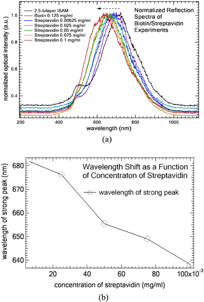 Finally, we demonstrate this ISAM gold thin-films coated fiber probe for use as a biosensor by using biotin-streptavidin bioconjugate pair [16]. Biotin and streptavidin were dissolved in phosphate buffered saline (PBS) buffer at pH = 7.4 (Sigma-Aldrich Corp.) First, a 12.5-bilayers ISAM gold film (12-bilayers PAH/AuNP followed by 1 monolayer PAH) was deposited onto the fiber tip to obtain the two-peak feature. Then, the fiber probe was immersed in the biotin solution of PBS for 40 minutes to obtain biotinylated-PAH. After rinsing it thoroughly with PBS solution, the LSPR fiber probe was obtained. The probe was immersed into streptavidin solution of PBS for 15 minutes, and rinsed thoroughly by PBS solution. In our concentration experiment, the same fiber probe was used to detect streptavidin solutions of various concentrations. We monitored the wavelength shift of the longer-wavelength strong peak. Figure 6a shows the normalized reflection spectra measured in air as a function of the concentration of streptavidin solution and Figure 6b shows the corresponding wavelength shift as a function of concentration of streptavidin. Black dash arrow indicates the direction of the wavelength shift of the longer-wavelength strong peak as concentration of streptavidin solution increases. We notice (a) the small LSPR-induced attenuation at 570 nm gradually smoothes and disappears; and (b) the wavelength of the longer-wavelength strong peak red-shifts to the shorter wavelength as the concentration of streptavidin increases. In Figure 6, eventually the film surface became uniform organic films (i.e., biotin-streptavidin bilayer) and the original isolated individual/aggregated AuNPs were fully buried under organic films. As such, the resulting composite film losg individual AuNPs’ LSPR peak property. The attenuation valley disappeared and the strong peak shifted back to the shorter wavelength. The sensitivity is about 465.5 nm/(mg/mL) or 0.4655 nm/(μg/mL). Given that the resolution of the spectrometer is ∼0.0001 nm and the core diameter of the fiber is 50 μm, the corresponding sensitivity is ∼800 pg/mm2. Compared to the sensitivity (i.e., 10 pg/mm2) of traditional LSPR sensors based on SAM and lithography techniques [4,8], the sensitivity of this ISAM-based is only a factor of 80 poorer than the best LSPR sensitivities. In addition, its sensitivity can potentially be improved by further optimizations such as optimizing AuNPs in terms of size and shape, optimizing pH values of solutions, optimizing annealing process and so on. While retaining all of the other desirable features of LSPR sensors, the ISAM-based LSPR sensor owns several advantages such as simplicity, easy-to-fabricate, and cost-effectiveness.