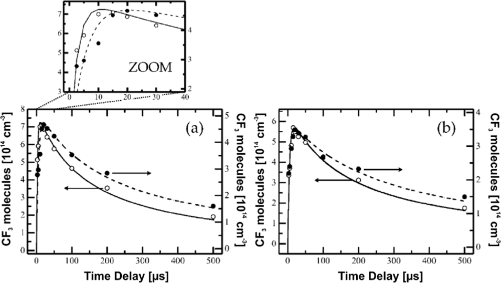 Another study concerned the production of CF3 during the photolysis of CF3I [57]. Spectroscopic data for CF3 lines obtained by spectral simulation were corrected by a factor to account for all non-linear absorption phenomena in the experimental 2.7 ... 5.3 mbar pressure range used (issue ii). Similar to C3F8, almost no structure was visible in the spectrum of C2F6, which is the main stable product due to CF3 recombination. It was therefore treated as an effective baseline contribution (issue i). Measurements were performed in direct single pass absorption spectroscopy using a glass cell of 50 cm length. A delayed trigger configuration was applied to achieve a time resolution of 5 μs at ∼1,253 cm−1 (7.98 μm). The CF3 density was monitored as a function of time after the photolysis laser pulse (Figure 10) and rate coefficients for both the vibrational relaxation and recombination of CF3 were extracted. Although the typical gas temperature inhomogeneities were absent in this first in-situ detection of a molecular radical, another feature of plasmas namely the formation of vibrationally excited products (Section 2.5.2.) and unknown relaxation channels remained as the main source of uncertainty of the diagnostics approach. In contrast to hydrocarbon plasmas the analysis of unblended CxFy absorption lines arising from different energy levels is hampered by the complex nature of the spectra. Nevertheless, a carefully selected spectral range encompassing minimal spectral overlap of different species makes p-QCLAS a reasonable tool for time resolved process monitoring and provides a link to industrial applications.