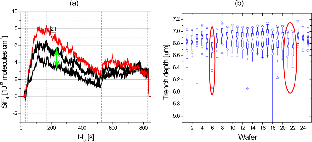 - Stancu, GD; Lang, N; Röpcke, J; Reinicke, M; Steinbach, A; Wege, S. In-situ monitoring of silicon plasma etching using a quantum cascade laser arrangement. Chem. Vapor. Depos 2007, 13, 351–360. [Google Scholar]