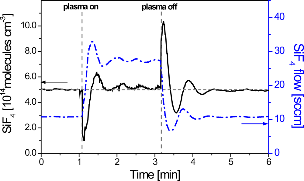 Next, the time traces of the molecules of interest can be scrutinized to gain a better insight into the kinetics. Discrimination between stable reaction products (issue i) has been reported for experiments in a pulsed CF4/H2 RF plasma. A double pass configuration (∼ 90 cm absorption path) was used at 0.1 mbar total pressure. Absorption signals from spectral micro-windows in two spectral regions at 1,271 cm−1 and 1,274 cm−1 which were covered by 300 ns pulses of a QCL at two different heat sink temperatures (Figure 5a) were deconvoluted to extract CF4 and C3F8 number densities. The time resolution was set by the QCL repetition rate of 5 ms while spectral averaging was achieved over 25 successive plasma pulses (see Figure 7b) [69]. The retrieved number densities were based on calibrated effective absorption cross section for CF4 and C3F8 (issue ii). In particular for the latter species no individual absorption features could be resolved due to spectral congestion. The temperature dependence of σeff was established by complementary experiments. Since only a moderate increase in the gas temperature was expected for this kind of pulsed RF plasma the calibration of σeff(T) was performed in a reference cell which was externally heated by a heating tape up to ∼ 380 K. A relatively pronounced change in σeff was found for CF4 and C3F8, e.g., for CF4 an increase in σeff of almost 50% at 380 K was detected [58]. Assuming an almost top-hat shaped mean gas temperature T(t) number densities were calculated for both the target (CF4) and product (C3F8) species. However, the temporal behavior and absolute values deduced for C3F8 did not accord with expectations for a stable higher fluorocarbon product and with complementary Fourier Transform IR measurements. It transpired that contributions from vibrationally excited molecules (e.g., CF4)—which are generally difficult to calibrate—have to be considered in the multi-species analysis [70].
