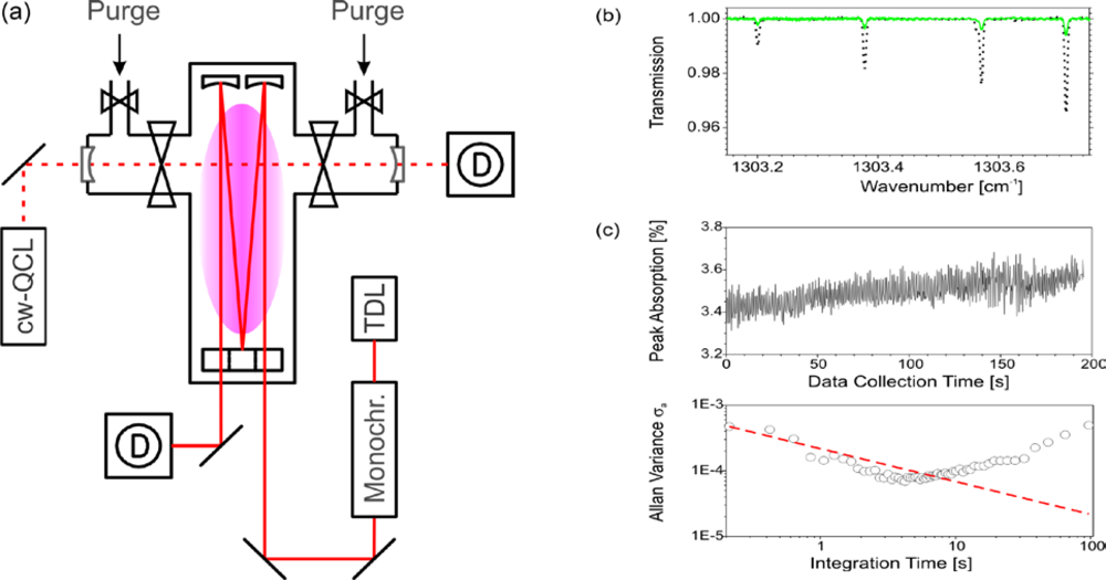 Meanwhile the availability of QCLs and ICLs as substitutes for lead salt TDLs has led to a rapid development of IR-LAS from a niche position to a standard diagnostic technique. In particular field applications of trace gas sensors are of increasing interest, e.g., for isotope measurements [23], atmospheric sensing [24], explosives detection [25] or breath analysis [26]. Additionally, the spectral characteristics of QCLs facilitated progress in non-spectroscopic applications such as frequency metrology [27], free-space optical communication [28] or near field microscopy [29]. In contrast QCL absorption spectroscopy (QCLAS) has only recently been recognized as an effective plasma diagnostic tool [30,31]. Further development of sophisticated plasma process monitoring [32] and control [33] devices in industrial environments should be forthcoming due to the room temperature operating capabilities of such spectrometers.