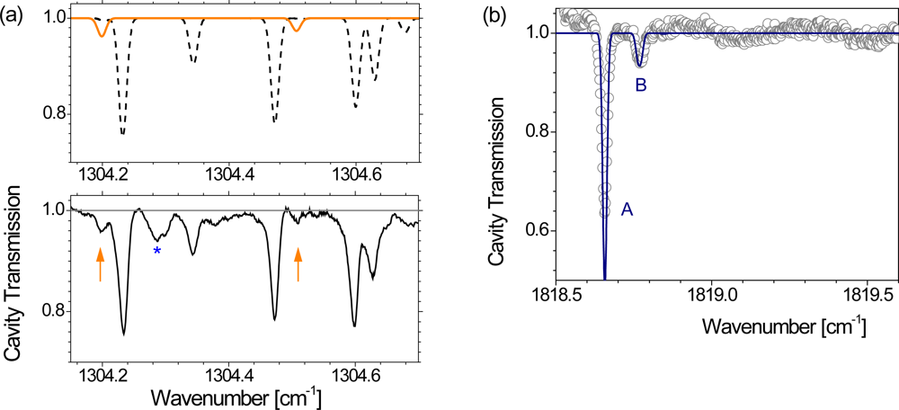 Sample spectrum and calibration curve of a stable molecular species, C2H2, obtained with a pulsed QCL at elevated pressure. (a) Transmission spectrum of a room temperature sample (19 cm absorption path) exhibiting no rapid passage features due to higher pressure (>50 mbar [30]). (b) C2H2 number densities determined from the line integrated absorption coefficient (LIA) of line P(23,e) for various experimental conditions at 298 K [56] (reprinted with permission from [56]. Copyright 2009, American Institute of Physics).