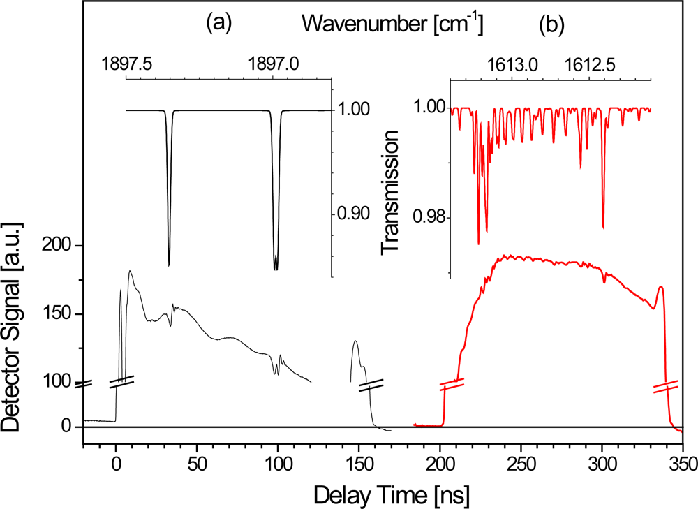 The sweep rates (α) measured in conjunction with pulsed QCLs are sufficiently high (≥ 0.001 cm−1/ns or 30 MHz/ns) to observe rapid passage effects for optical transitions under low pressure conditions [48,49]. Rapid passage is generally accomplished by sweeping the source or detuning the resonance frequency by means of external fields on time scales shorter than 1/γ and was, for example, described for magnetic resonance transitions when the external field is rapidly swept over the transition [50]. Assuming pressures below 10 mbar yields typical collisional half widths of < 1 × 10−3 cm−1 which corresponds to relaxation rates γ below 30 MHz. Characteristic Doppler broadening in the mid-IR is approximately of the same order (1 × 10−3 cm−1). Thus, it can be concluded from the above mentioned laser sweep rates of ∼0.001 cm−1/ns that the QCL emission stays about a nanosecond in resonance with an absorption feature [51]. Such a 1 ns interaction time is clearly shorter than 1/γ (> 33 ns in this example) which is the important criterion for the appearance of rapid passage effects. The normalized sweep rate, A = α/γ2, which is often used to characterize such processes, would be 30. Hence the criterion for rapid passage phenomena, A ≫ 1 [50], is fulfilled. Since the lower limit chirp rate was assumed here this suggests that rapid passage obstacles are present with all pulsed QCLs at low pressures.