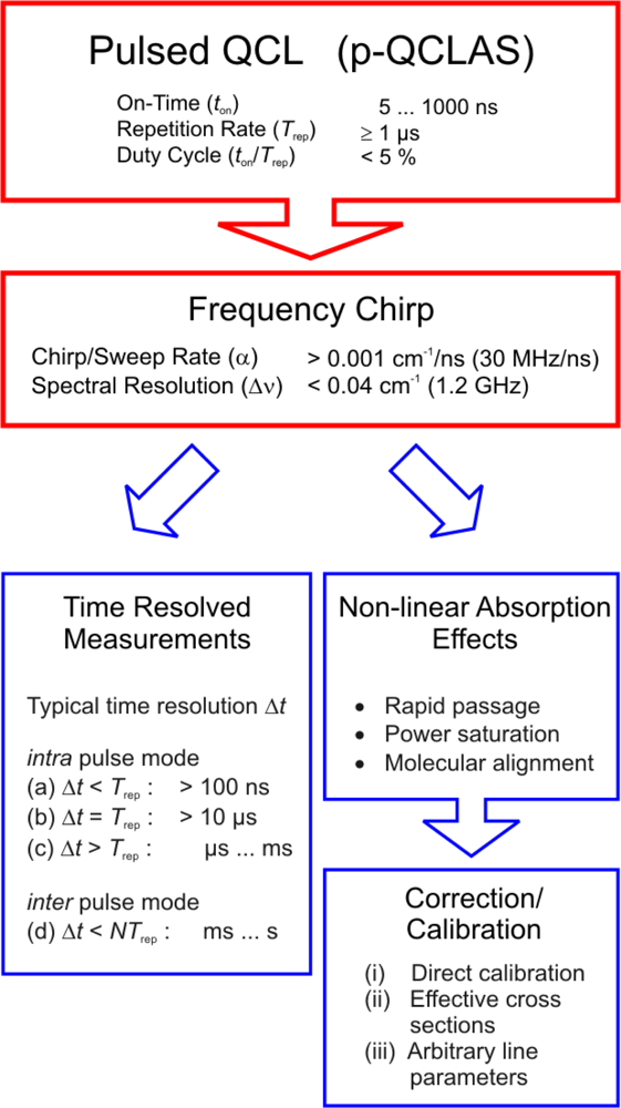 Nevertheless, the frequency chirp also offers advantages for chemical sensing: entire absorption spectra of up to ∼ 1 cm−1 (30 GHz) are recorded during a few hundred nanoseconds pulse width which fits very well to highly time resolved measurements of rapidly changing chemical processes. Studies under turbulent gas phase conditions are facilitated, because the data acquisition time is shorter than random fluctuations in the sub-millisecond range. Figure 2 collects the main issues and typical figures of merit that are connected with the application of pulsed QCLs. These are detailed in the following sections: Potential non-linear absorption effects and their treatment are briefly discussed in Sections 2.2 and 2.3 Time resolution issues are concerned in Section 2.4 Recent examples of these aspects of p-QCLAS will be presented (Section 2.5).