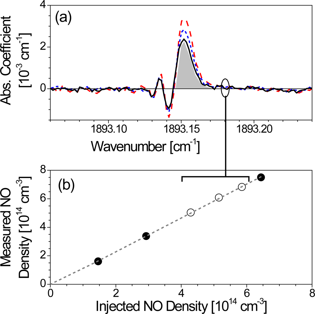 Sample spectrum and calibration curve of a stable molecular species, NO, obtained with a pulsed QCL under low pressure conditions. (a) Perturbed absorption coefficients of NO measured at 2.66 mbar (50 cm absorption length) for different mixing ratios (dashed—1.00%, dotted —0.80%, solid—0.67%. The patterned area was used to calculate number densities (at 296 K) which are plotted in (b) as open symbols (full symbols represent values at different pressures). The resulting correlation was then used to correct for non-linear absorption phenomena (adapted from [31]).