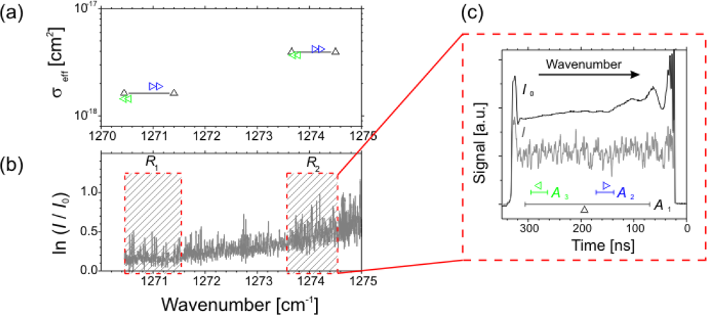 Figure 5b shows a CF4 overview spectrum merged from several chirped QCL pulses. For two of these intra pulse sweeps (R1 and R2) spectral micro-windows were defined, namely A1, A2 and A3 (Figure 5c), for which effective cross sections could be determined. Although the spectral coverage of the micro-windows is different the σeff <ν> values are in good agreement (Figure 5a) [58].