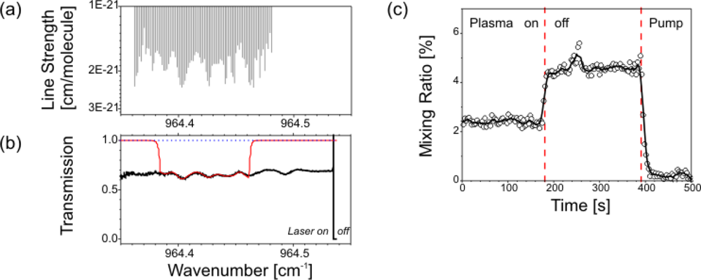 (a) Calibrated BCl3 stick spectrum. (b) The line strength data from (a) were used to achieve a fit (thin solid line) to the measured transmission spectra (heavy solid line) through a MW reactor. The laser signal was turned off momentarily to record the detector offset signal. All inter pulse spectra were normalized to a previously acquired baseline (dotted line). (c) Time resolved BCl3 mixing ratios measured in a H2/Ar/BCl3 MW discharge (2 mbar) using the advanced fit procedure for complex spectra depicted in (b) (adapted and enlarged from [63]).