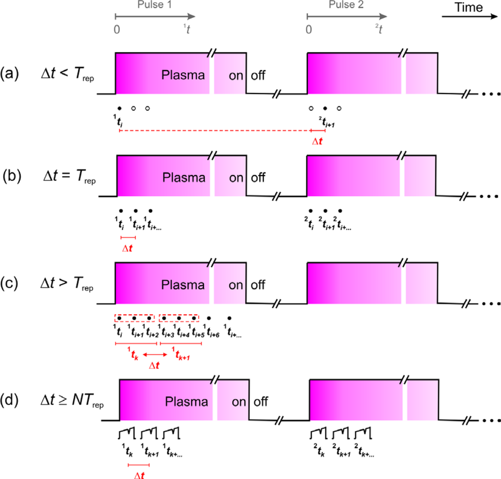 If a time resolution below the laser repetition period is required (Δt < Trep, Figure 7a), a delayed trigger scheme has to be applied [31,57]. By changing the delay time after igniting different plasma pulses the discharge is probed with Δt = 2ti+1 – 1ti and thus Δt is set by the difference in delay times for different plasma pulses m. The lower limit is, of course, given by the laser pulse width (Δt ≥ ton). The SNR may be increased by averaging several single shot spectra of the same delay time (<1ti, 2ti, 3ti, …>).