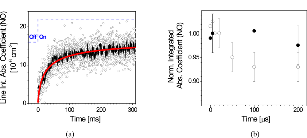 (a) Line integrated absorption coefficient (LIA divided by L) of NO during the first 300 ms of a pulsed RF plasma. Measurements were performed every 0.2 ms (open circles). Binning of 6 spectra (thin solid line) yields a better SNR and an effective 1 ms time resolution. The trend (heavy solid line) serves as a guide to the eye. (b) Normalized LIA of NO measured during the first 200 μs of a pulsed 1 ms DC discharge. The uncertainty of single shot results (full black circles) could be reduced by averaging over 5 plasma cycles (open grey circles) at the expense of a drastically increased measurement and post-processing time (enlarged from [31]).
